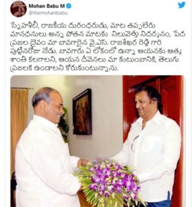 ఇవాళ వైఎస్ఆర్ జయంతి సందర్బంగా ప్రముఖులంతా ఆయన చేసిన సేవల్ని మరోసారి గుర్తు చేసుకుంటున్నారు. వైఎస్ఆర్ బంధువు, జగన్ సన్నిహితుడైన మంచు మోహన్ బాబు ఈ సందర్భంగా ట్వీట్ చేశారు.