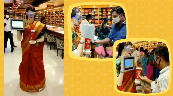 తమిళనాడులోని ఓ షాపింగ్ కాంప్లెక్సులో రోబో శానిటైజర్ వేస్తోంది. కరోనా విజృంభిస్తున్న నేపథ్యంలో సిబ్బంది కస్టమర్లకు నేరుగా శానిటైజర్ వేయడం అంత మంచిది కాదని ఆ దుకాణం యజమాని వినూత్నంగా ఆలోచన చేశారు. షాపులో ఓ రోబోను పెట్టి చీరకట్టి అలంకరించారు. దీంతో రోబోకు అందమైన చీరకట్టి పబ్లిసిటీ చేసుకుంటున్నారు.