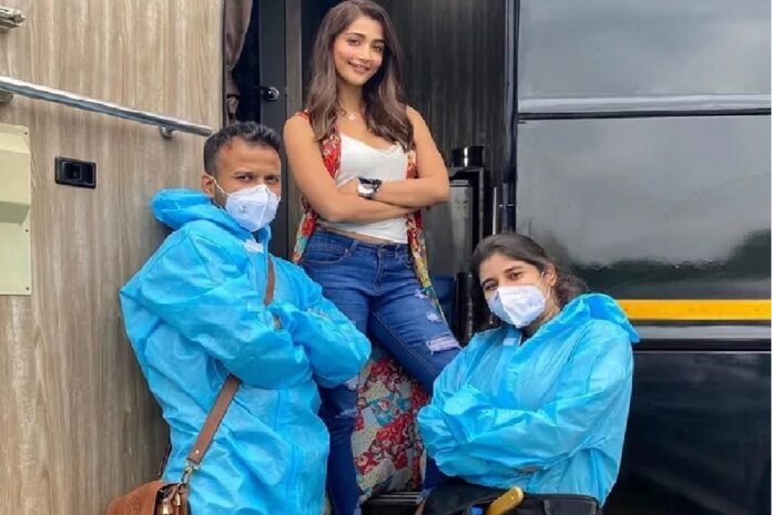 She posted the pictures from the sets along with her personal staff who were dressed in PPE suits. Pooja Hegde looked charming and energetic like ever before in the click.